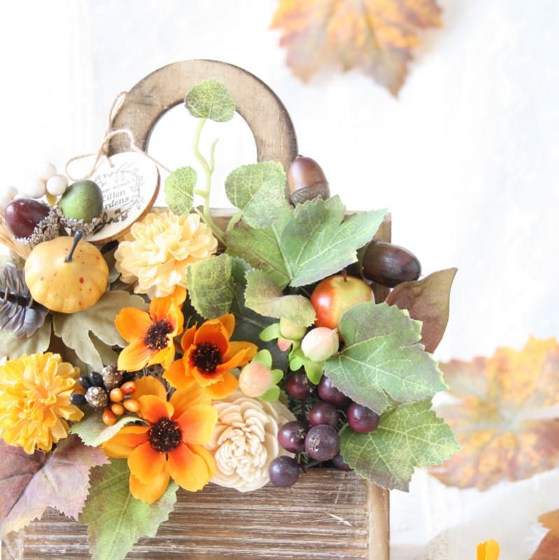 木製バッグの中に 秋の実りを詰め込んだ、暖色カラーのフラワーアレンジメント。