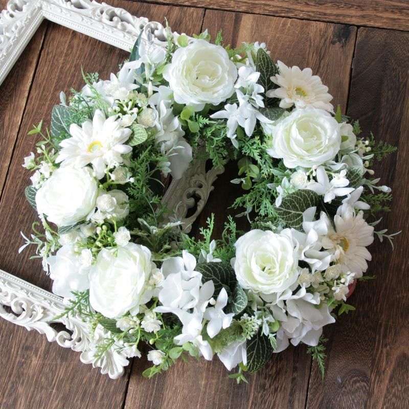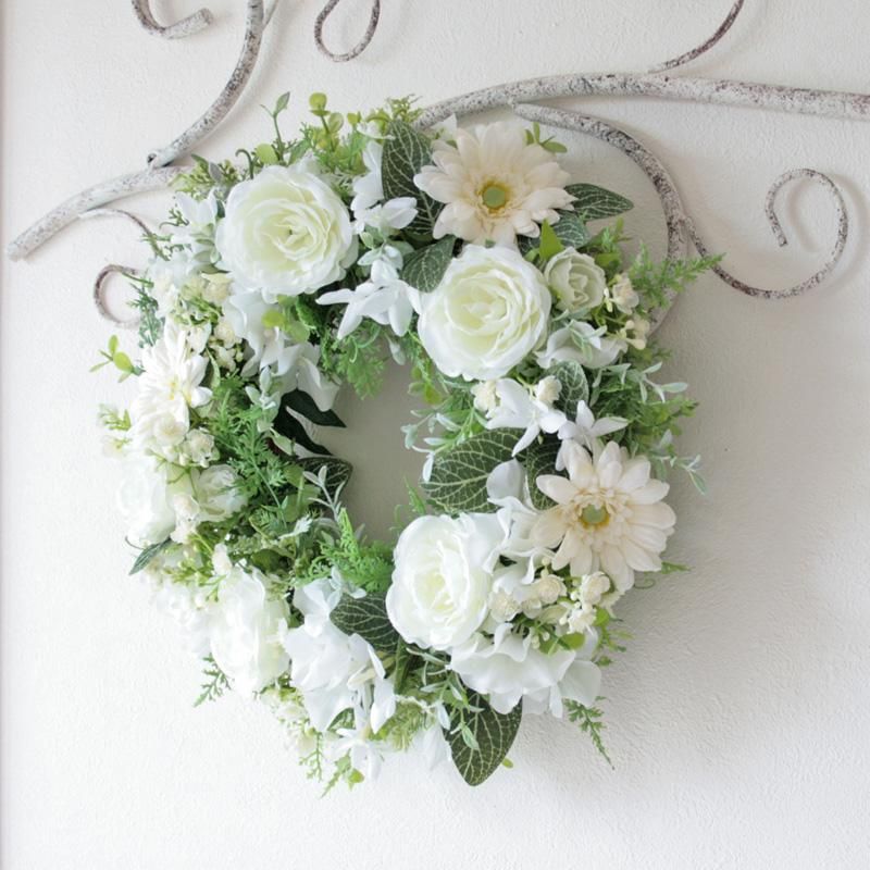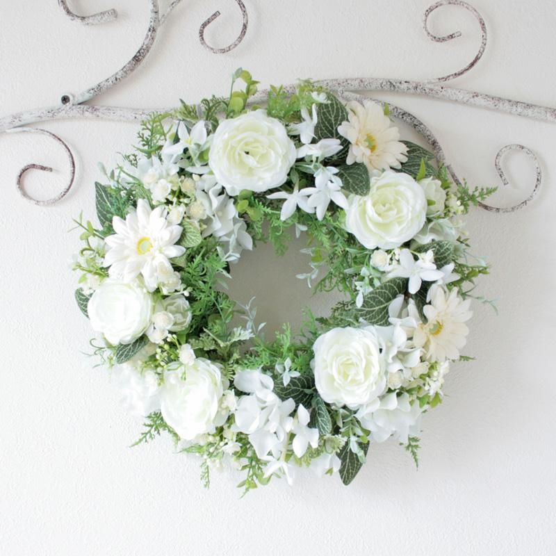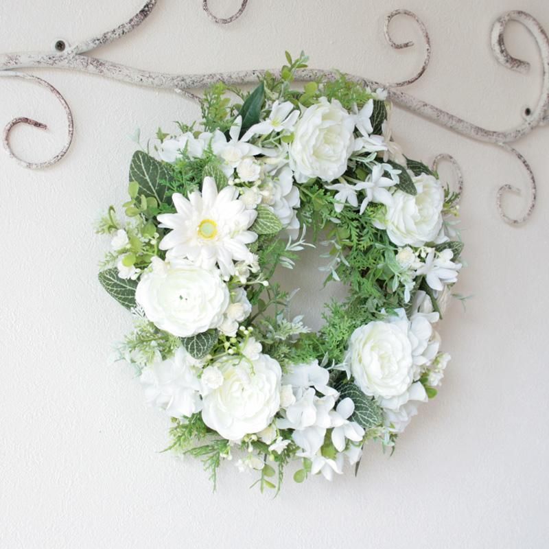 純白のリースは、清らかさと永遠の意味を込めて、結婚祝いや新築祝いなど特別なギフトにも最適です。